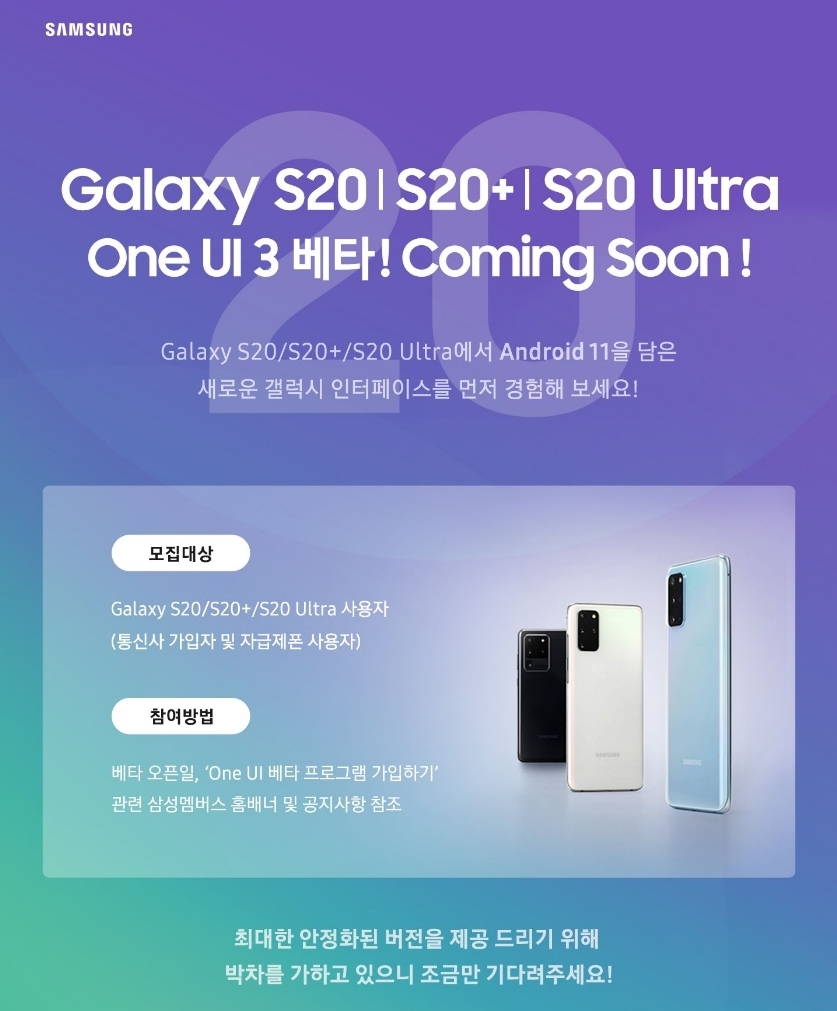 갤럭시 S20 One UI 3(.0) 베타 모집 대상은 갤럭시 S20 / S20+ / S20 울트라 통신사 가입자 및 자급제 폰 사용자를 대상으로 진행된다고 합니다.