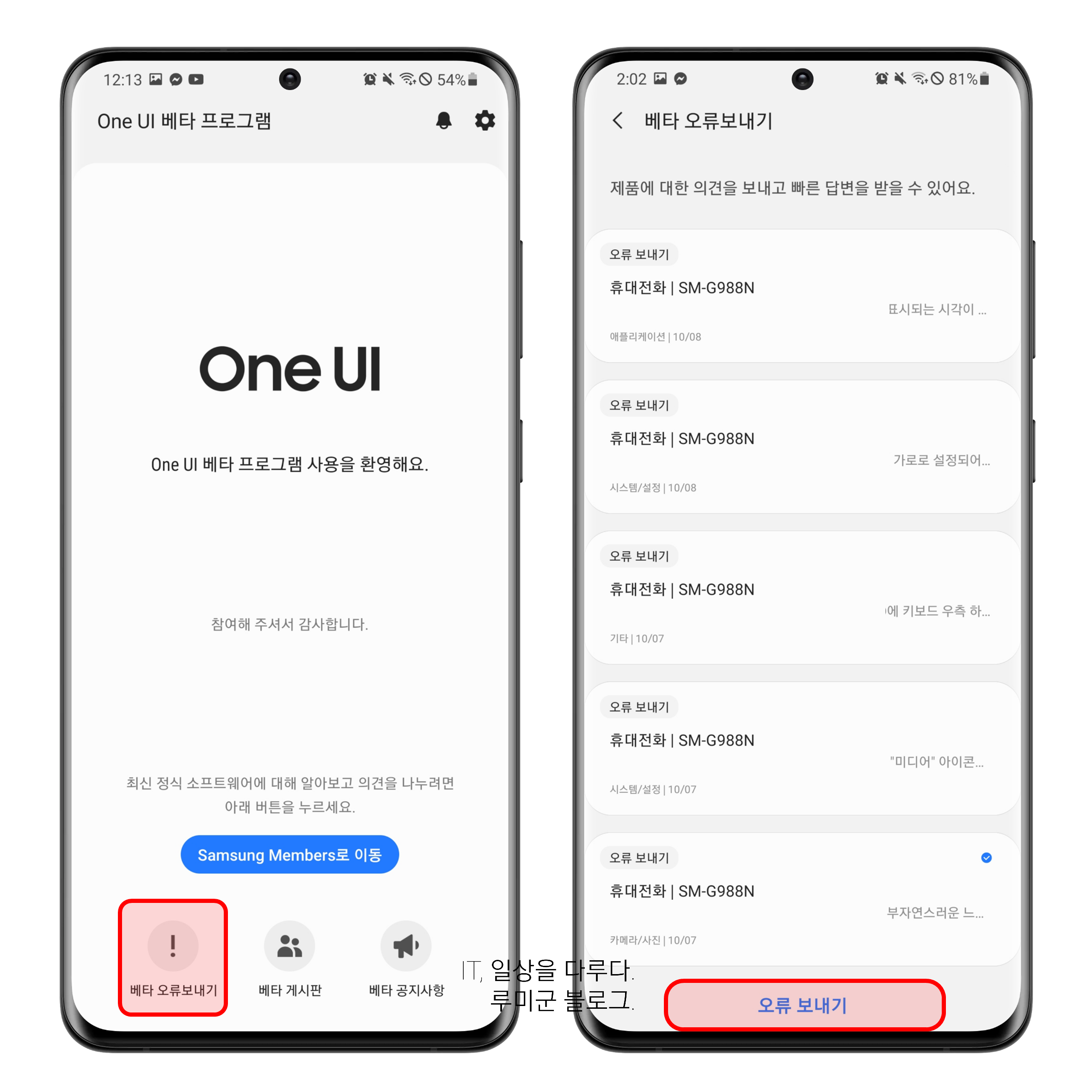 베타 오류 보내기 방법은 삼성멤버스에서 가능합니다. 베타 펌웨어가 설치되었다면 삼성멤버스 접속시 처음에 신청할때와는 다른 화면인 멤버스 베타 모드로 보이게됩니다. 하단 왼쪽에 베타 오류 보내기를 선택하면 베타 오류 보내기 및 내가 보낸 내역 확인이 가능합니다.