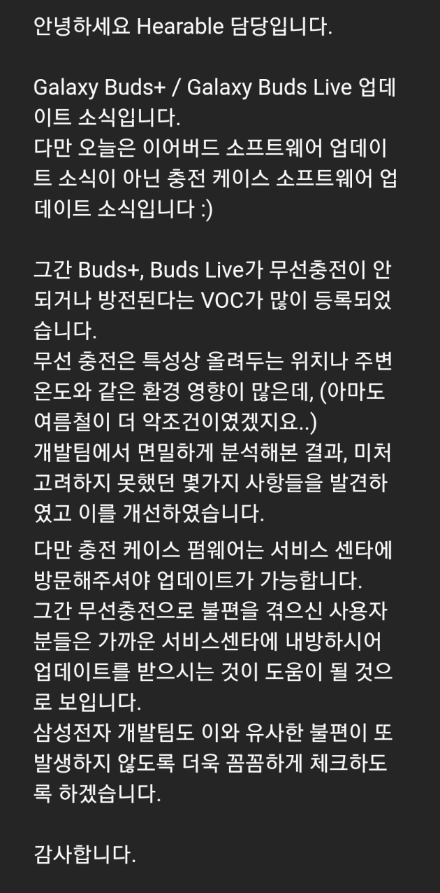원문 중 일부: "그간 Buds+, Buds Live가 무선충전이 안되거나 방전된다는 VOC가 많이 등록되었습니다.