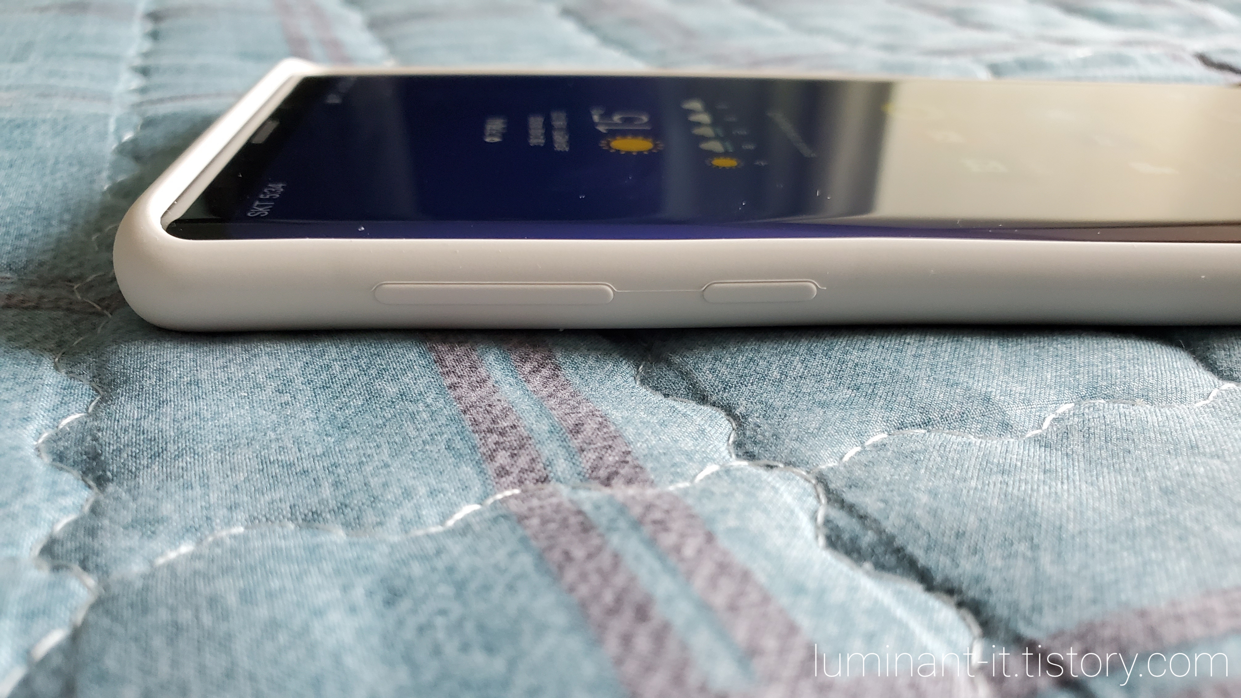 실리콘 커버의 좌측과 우측에는 볼륨버튼과 빅스비 보이스 버튼/전원 버튼을 누를수 있도록 버튼 부분이 튀어나와 있습니다. 정품 케이스라 그런지 버튼도 잘 눌러지고, 버튼과 케이스의 버튼 부분이 딱 맞았습니다.