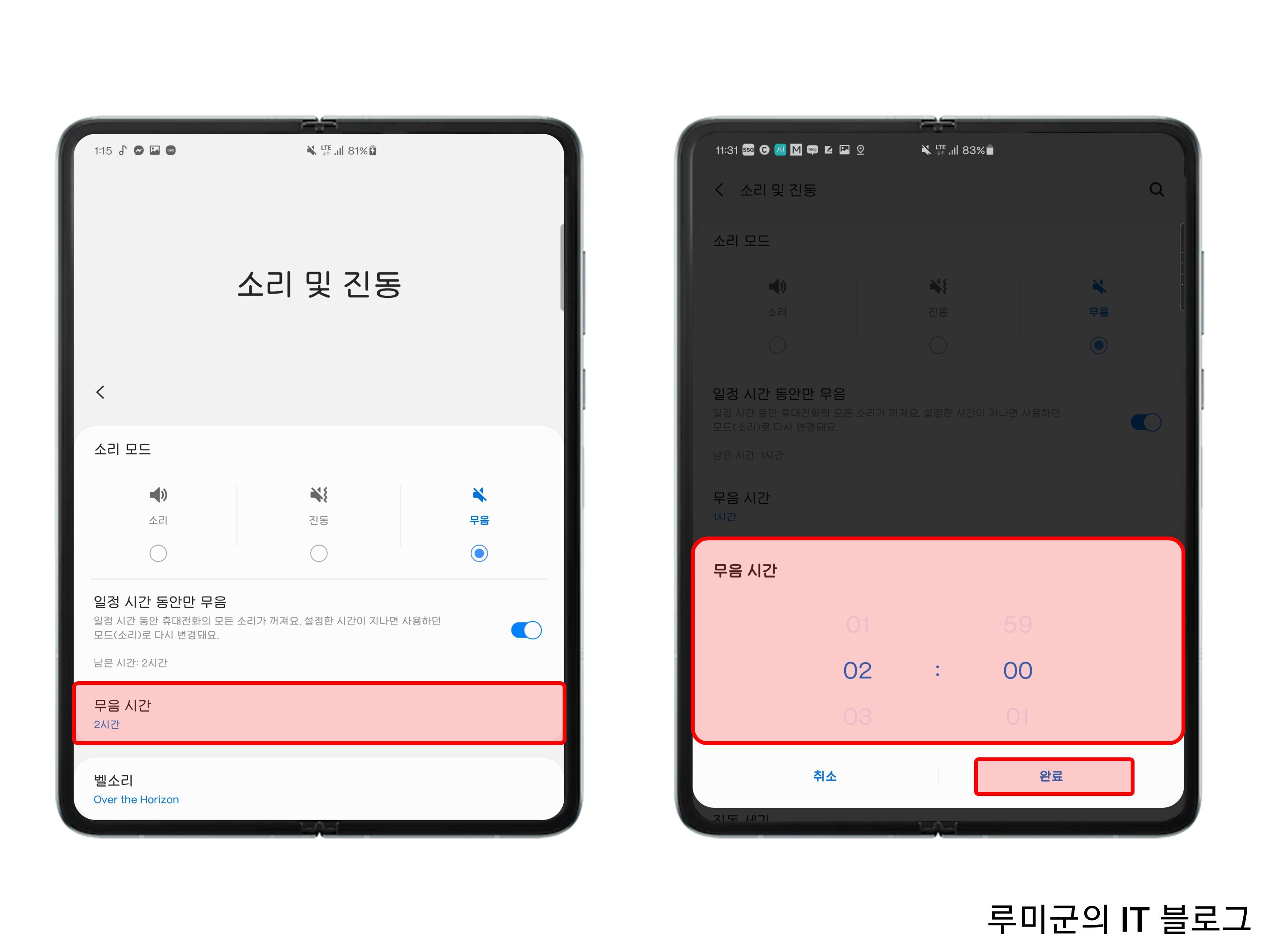상세정보에서 무음 시간 클릭 후 내가 무음으로 사용할 시간을 정하고 완료를 눌러줍니다.