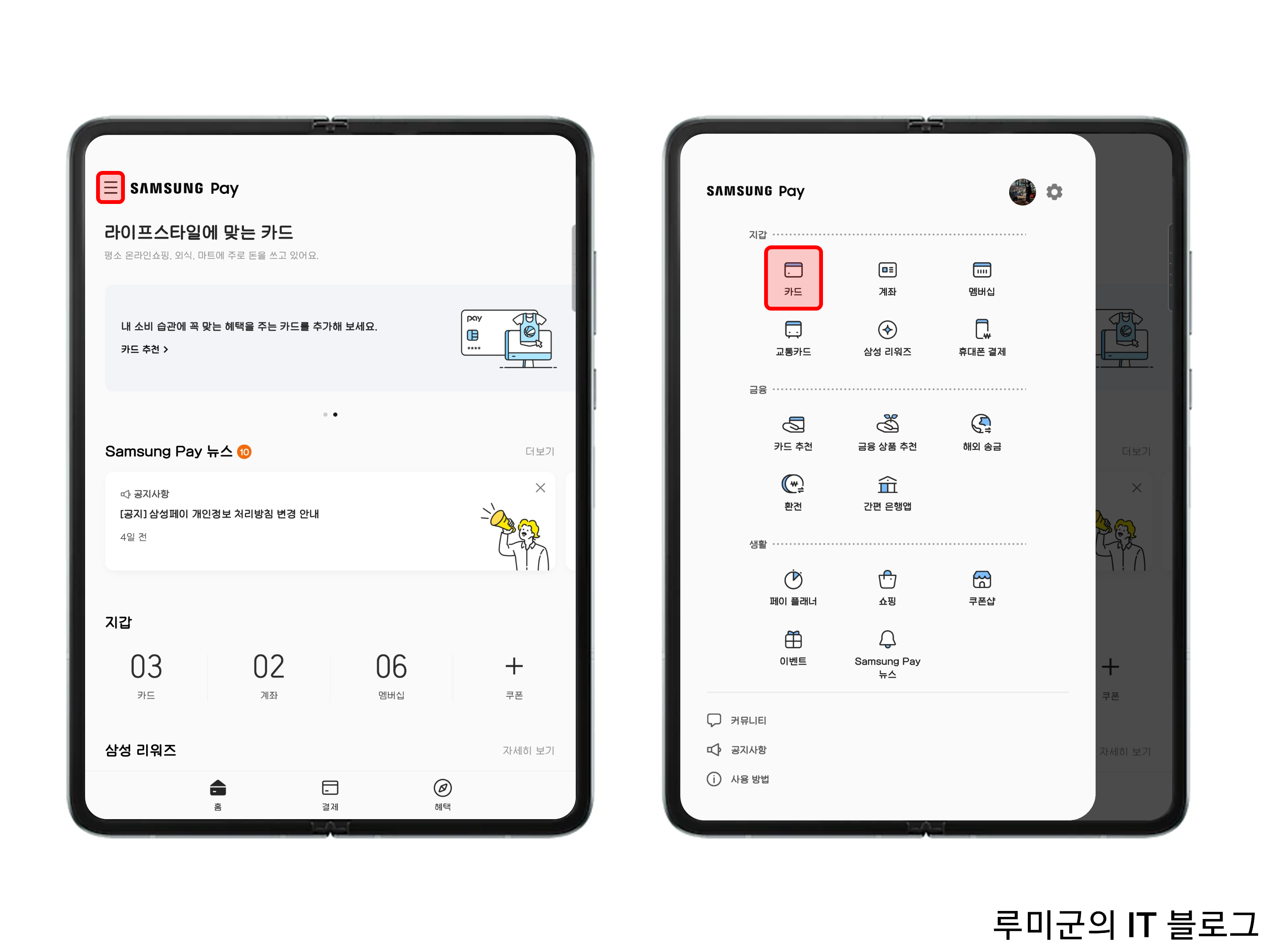 삼성페이 앱에 접속하여 좌측 상단 메뉴 아이콘 [ ≡ ]을 누르고 여러 메뉴 중 "카드"를 클릭합니다.