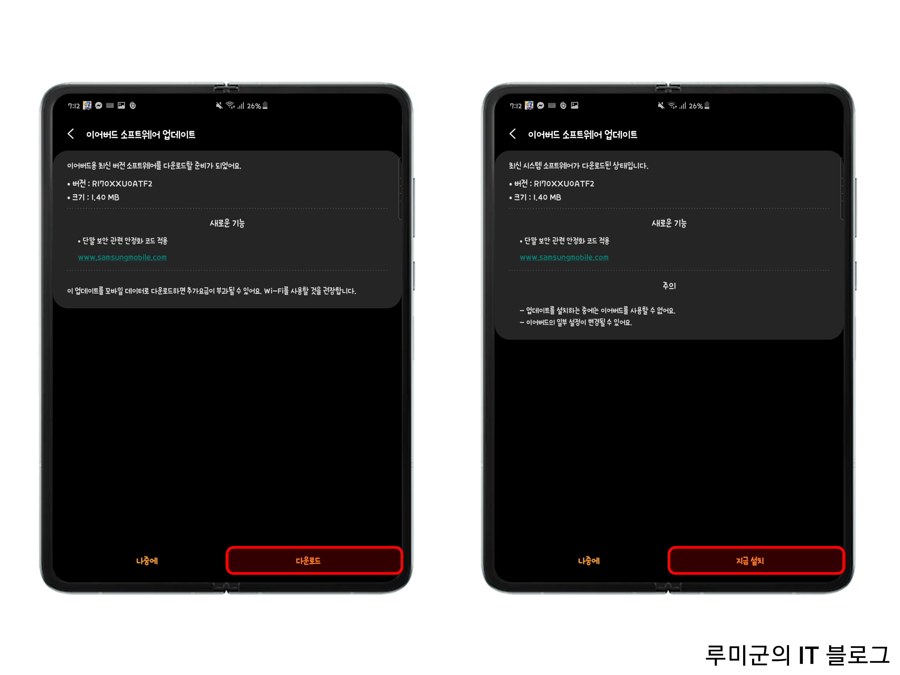 업데이트 중에는 이어버드의 연결이 해제될 수 있고, 사용이 불가합니다!